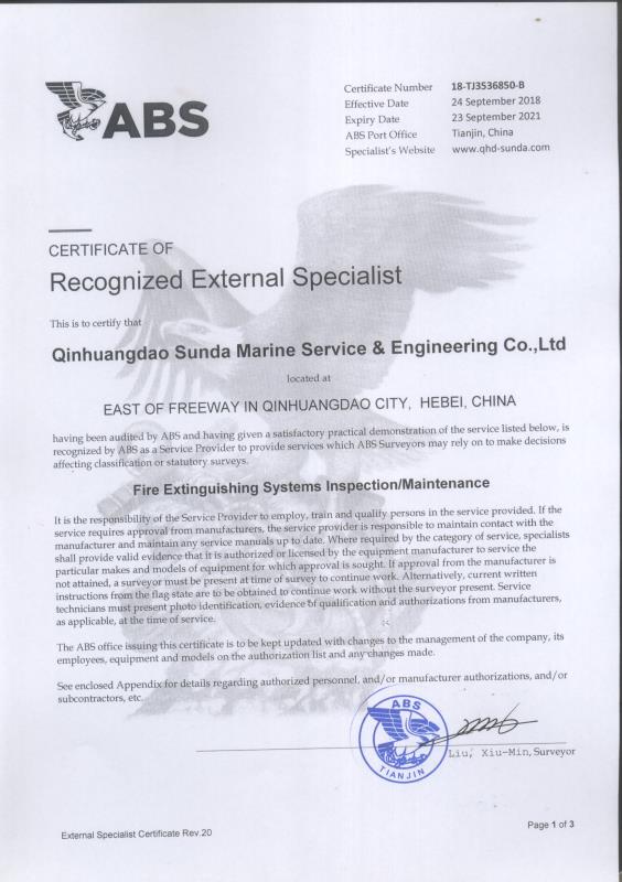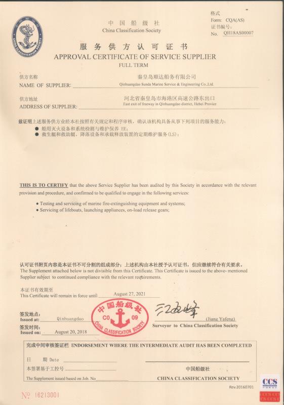 秦皇島順達(dá)船務(wù)有限公司位于美麗的海濱城市、中國(guó)北方著名的能源輸出大港--秦皇島。公司從事于船舶修理、物料供應(yīng)、水下檢測(cè)、船體測(cè)厚、消防救生設(shè)備及救生艇檢驗(yàn)、電氣自動(dòng)化修理等服務(wù)。 公司自1997年成立至今,先后為國(guó)內(nèi)外船東修理、檢驗(yàn)各類船舶萬余艘,積累了豐富的施工經(jīng)驗(yàn)。公司現(xiàn)有場(chǎng)地100余畝,員工30余人,以及工程用車若干臺(tái)。我們公司一直本著嚴(yán)以律己、真誠(chéng)待人、精益求精、信譽(yù)至上的經(jīng)營(yíng)理念,以優(yōu)質(zhì)的服務(wù)、專業(yè)的施工、合理的收費(fèi),得到了國(guó)內(nèi)外船東的廣泛認(rèn)可,贏得了良好的口碑和信譽(yù)。 公司已取得了中國(guó)船級(jí)社(CCS)、美國(guó)船級(jí)社(ABS)、日本船級(jí)社(NK)、德國(guó)船級(jí)社(DNV GL)等各個(gè)船級(jí)社的消防救生和救生艇檢驗(yàn)資質(zhì), ...